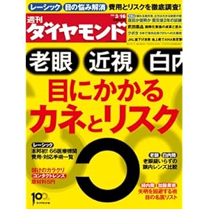 「週刊ダイヤモンド 2013/3/16号」の特集は『目にかかるカネとリスク』だ。近視・老眼の矯正や白内障治療などは、技術の進歩が目覚ましい。ところが、視力矯正手術である「レーシック」ひとつをとってみても、各医療機関が掲げる術式の内容やデメリット、コストがわかりにくかったり、サービスの内容に怪しさが伴うこともある。そこで、目の矯正や治療にかかるカネとリスクを徹底調査した特集だ。