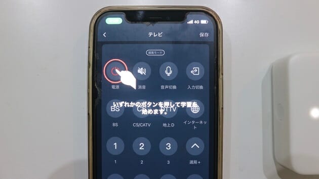 照明も同じようにスマートラーニングで追加できたが、テレビはリモコンが自動認識されなかったため、カスタマイズで追加してみることに。リモコン上のボタンをSwitchBotに向かって押し、アプリの画面上でもリモコンと同じ操作をタップすると学習され、テレビも無事にスマホで操作ができるようになった。