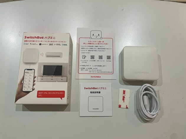 まずはSwitchBotのパッケージを開封。中には機器本体、マイクロUSBケーブル、両面テープ、取扱説明書が入っている。あわせてセットアップの方法やサポートについて記載された紙も同封されていて、初心者でも安心できる案内付きだ。