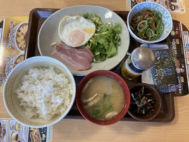 すき家「牛小鉢ベーコンエッグ朝食」(税込450円)/一番ボリューミーでコスパ最強?