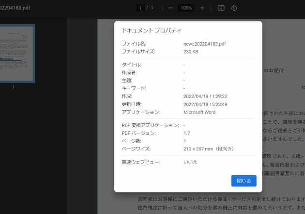前述の謝罪文の“主語”は企業としての吉野家であり、吉野家が同社役員の不祥事を謝罪しているようにみえる。しかし、この“お詫び”のPDFファイルのドキュメントプロパティの作成者名に“Ito Masaaki”とあったため、Twitter上で「本人がお詫び文を書いたのか?」との指摘が続出したようだ。当該PDFファイルは18日11時29分22秒に作成。同日15時23分49秒に更新され、19日午前10時現在、作成者は空欄となっている。