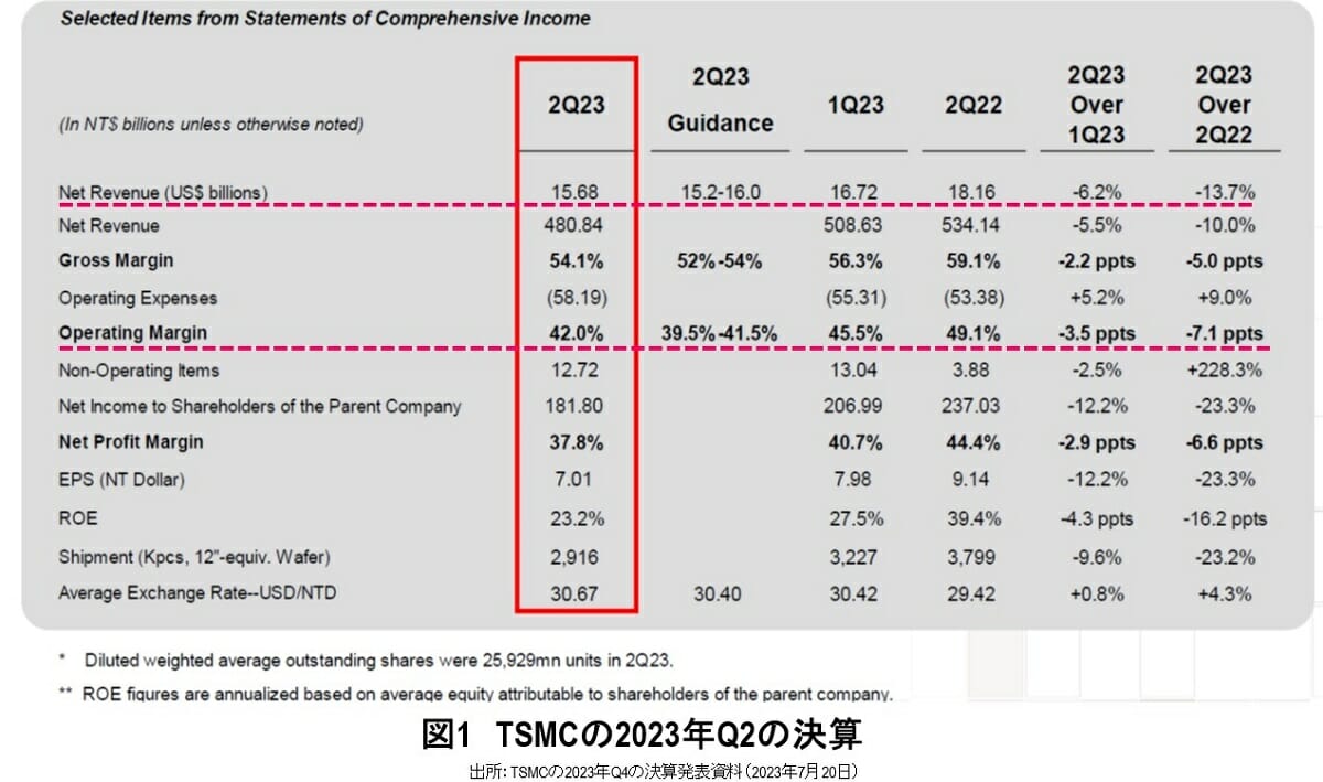 2023年7月20日に行われた台湾積体電路製造(TSMC)の2023年第2四半期(Q2)の決算発表が、半導体業界に衝撃を与えた。TSMCは四半期として2019年Q1以来、4年ぶりに減収減益となったからだ(図1)。