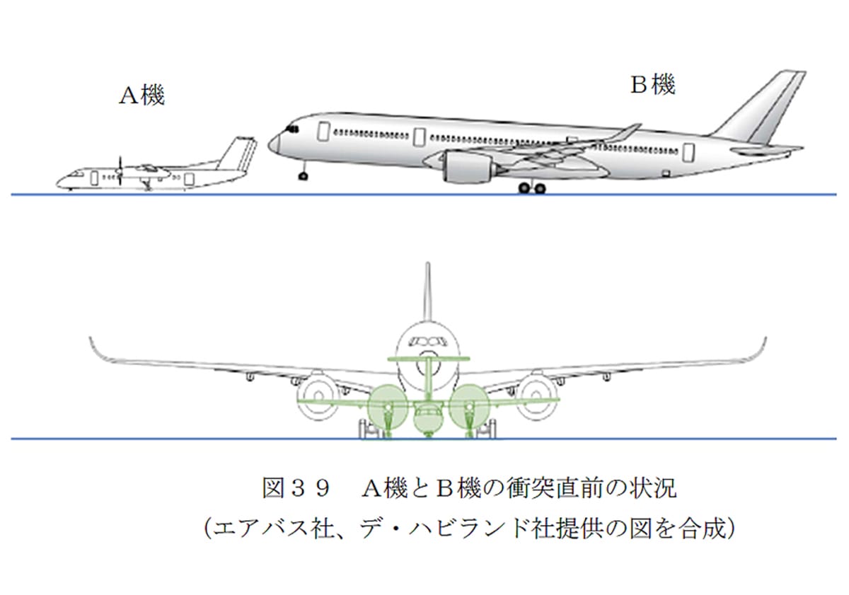 JAL機は前輪が接地する前に海保機と衝突したため操縦席と前方客室の破壊を免れた可能性がある。報告書は、JAL機のフライト・レコーダーの記録から、衝突時、JAL機の姿勢は3.5°上向きで前輪が接地していなかったことを明らかにし、両機が衝突したときの位置関係を下図のように示している。