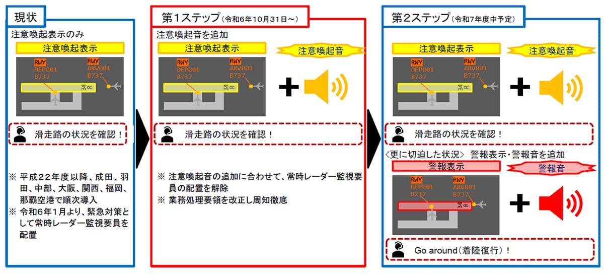 なお、1月2日付産経新聞の報道によれば、航空局は、2025年度以降に、上記の警報表示・警報音が発動された場合は、管制官の判断なしに自動でパイロットに着陸のやり直し(着陸復行)を指示する方向で検討中という。