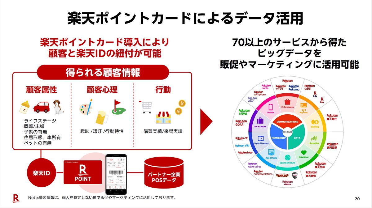 楽天ポイントカードを利用しない願客の行動を、AIと店舗データと活用して推論する活用も始めている。楽天ペイメントは楽天ペイやポイントカードを利用したユーザーのデータは豊富にあるが、それらを利用しない願客は一定層おり、願客全体の傾向が掴みづらかったという。ポイントカードを利用するユーザーが7割であったとしても、AIでポイントカード非利用者のデータを補完することによって、9割程度の願客を想定し意思決定ができることを強みとしている。