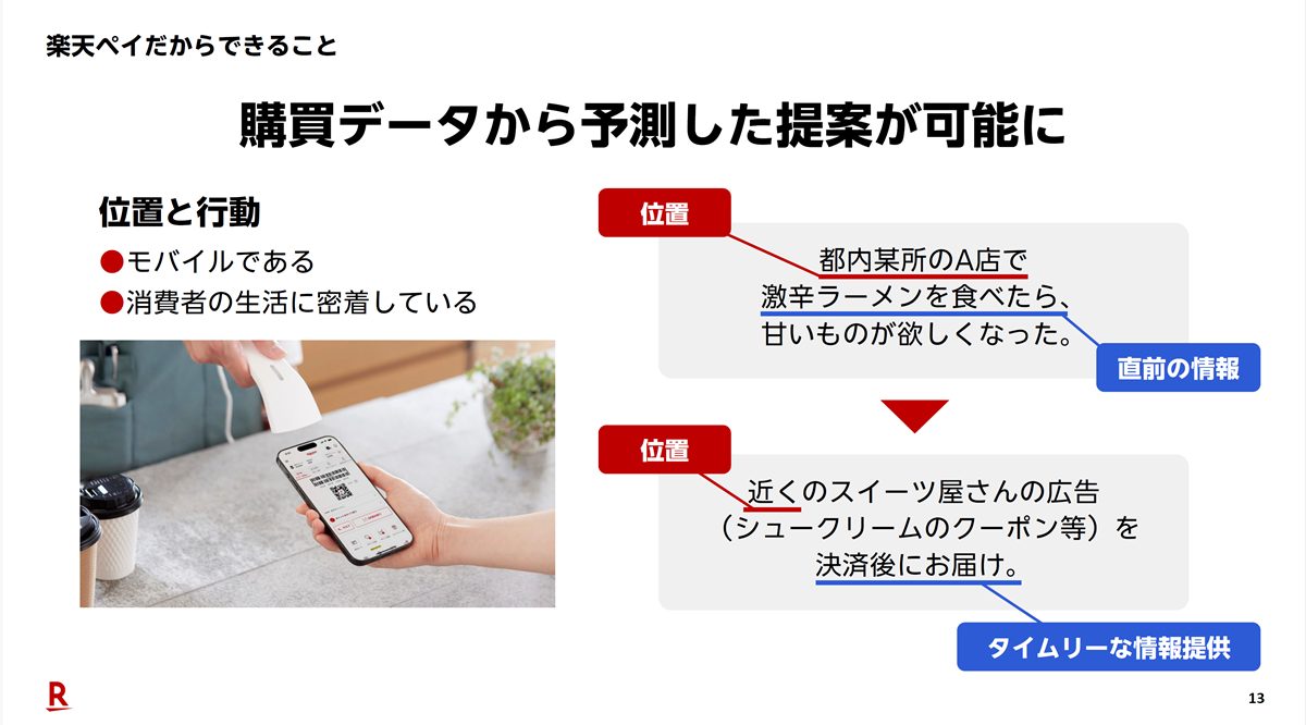 AIを活用することで消費者心理を先読みし、より適した情報を提供できるようになるという。例えば、とある場所で激辛ラーメンを食べ、楽天ペイで代金を支払ったユーザーが居るとする。従来のサービスでは「激辛好きのユーザー」と判断され、似たような激辛の食事を提案することができた。しかし、ここでAIを活用すると「辛い物を食べたあとに甘いものを食べたくなる」という消費者の心理や次の行動などをAIが予測し、消費者に対して近所のスイーツ店の情報やクーポンなど、一歩進んだ情報を提供することができるとしている。