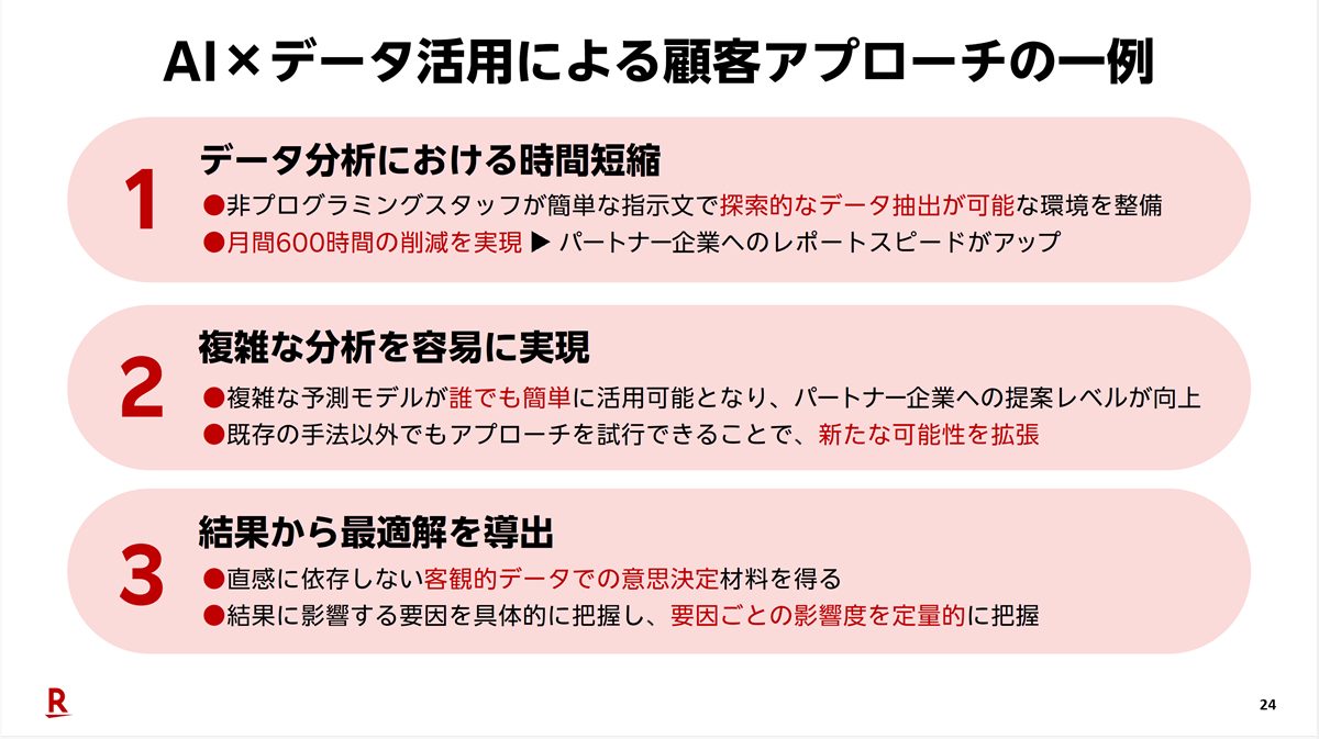 楽天ペイメントのAI×データ活用による願客アプローチの一例として「データ分析における時間短縮」「複雑な分析を容易に実現」「結果から最適解を導出」の3つを挙げた。データの抽出や分析は、従来であれば専任のアナリストやデータエンジニアが必要になる。そこにAIを活用することによって、誰でも単純な指示文でデータ抽出ができる環境を整備できたとしている。それにより月間600時間の作業時間を削減でき、関連企業への対応スピードも速くなったという。また、AIにより複雑な予測が誰でも簡単に利用できるため、関連企業に対して提案の質が向上し既存以外の手法でもアプローチできることで、新たに可能性が広がったという。さらに、人間の直感に依存せずデータにより客観的な意思決定が可能となり、結果に影響する要因や、要因ごとの影響度を把握できるようになったとしている。AIの導入によりデータの抽出や分析は誰でもできるようになったが、専任のアナリストやデータエンジニアは引き続き配置しており、AIと併用する体制を整えているという。