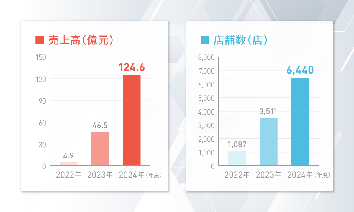 創業からわずか8年ほどだが、店舗数はすでに7000店舗に迫る。売上高は2022年度で4.9億元(約100億円)だったが、2024年度には124.1億元まで成長。2年間で実に25倍もの売上拡大を実現している。