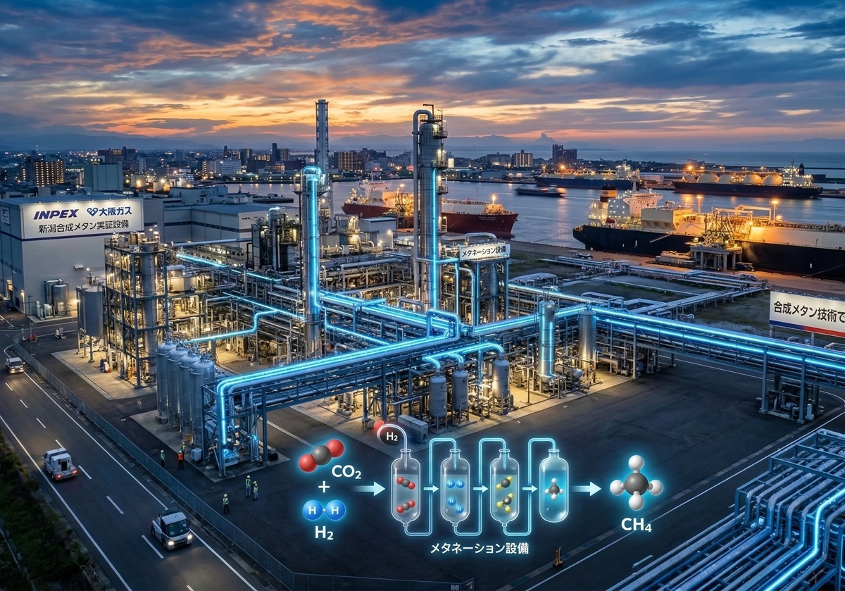 2026年2月、エネルギー大手のINPEXと大阪ガスが、世界最大級の合成メタン(e-methane)製造設備の実証運転を開始した。