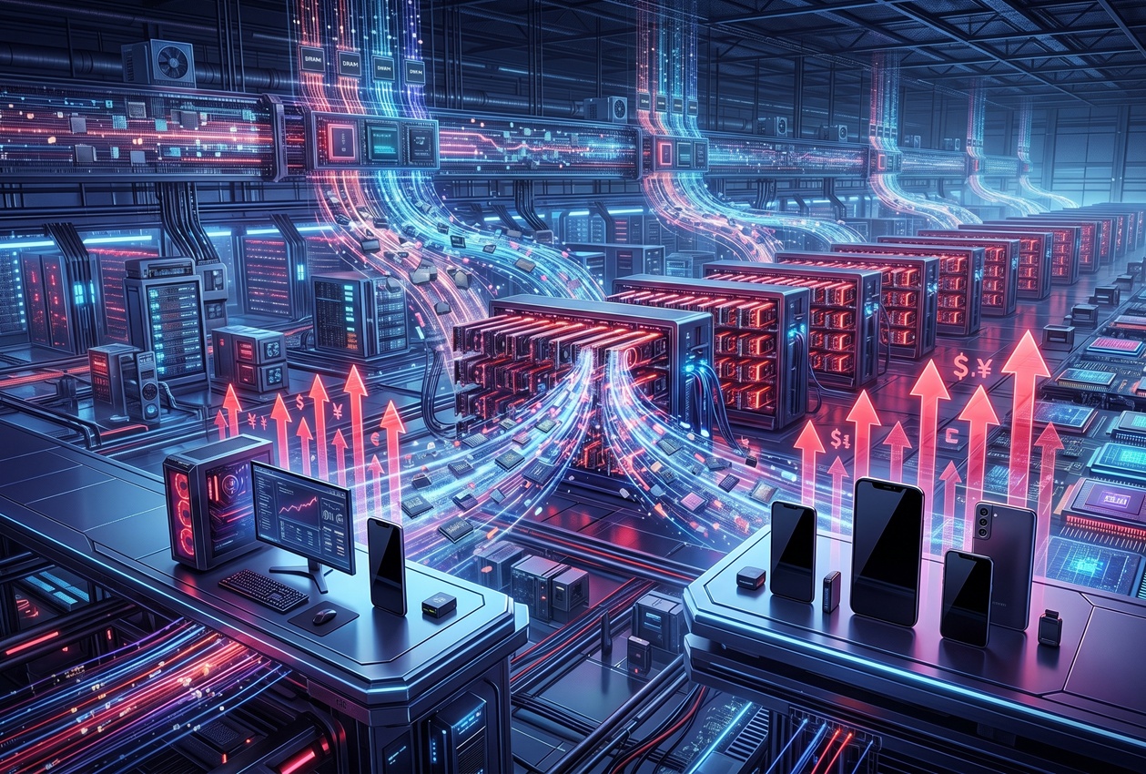 2026年春、世界の消費者電子機器市場に異変が起きている。Lenovo、Acer、HPといったPCメーカーが相次いで価格改定を実施。スマートフォン市場でも、XiaomiのCFOが「2026年モデルのDRAMコストは25%超の上昇を見込む」と公言し、中国の主要OEMが軒並み新モデルの希望小売価格を引き上げている。