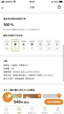 気になる商品を見つけてクリックすると、その商品の詳細ページへと移る。原産地や内容量、消費期限などが表示されるほか、直近90日間の出荷完了率も確認できる。産地直送なので、そのときどきの収穫率で発送に影響する可能性があることも頭に入れておくべきだろう。そして、直近でお届けできる日も案内される。最短翌日に届くという仕様になっているのだが、地域によってどうしても差が発生するらしく、東京の23区外に住む筆者の場合、最短でも2日かかる商品がほとんどだった。