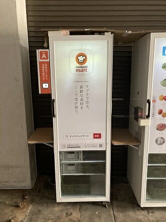 こちらがマートステーション。左側にある読み取り機にQRコードを読み込ませると、ドアが開けるようになり、商品を取り出せる。中身にはかご一つひとつに商品が入っており、自分の設定した受け取り名の商品を手に取る。