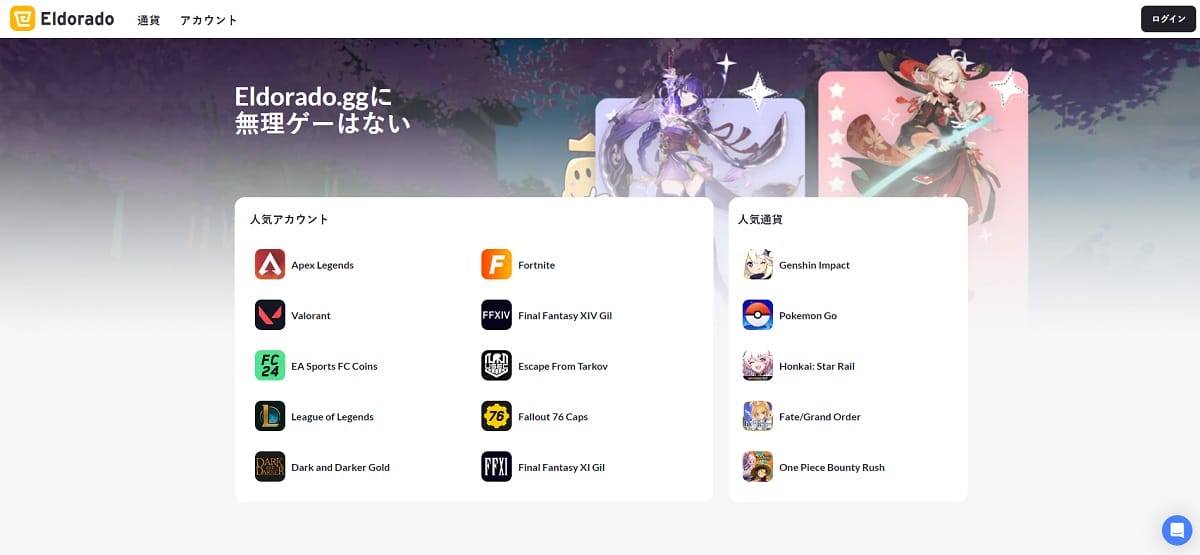 Eldoradoを通じてアイテムや通貨を購入するのが、ゲーム内のアイテムを最速で入手する手段であることは明らかです。また、このウェブサイトはゲーム内の体験をカスタマイズするのにも役立ちます。もしあなたが幻神インパクトのファンで、お気に入りのゲームを新たにプレイしたいのであれば、幻神アカウント販売を選択することで堂々とファンタジーの世界に足を踏み入れることができます。あるいは、WoWやRuneScapeなど、お気に入りのMMOをさらにパワーアップさせて、最強のプレイヤーと足並みを揃えたいですか?もちろん可能です!