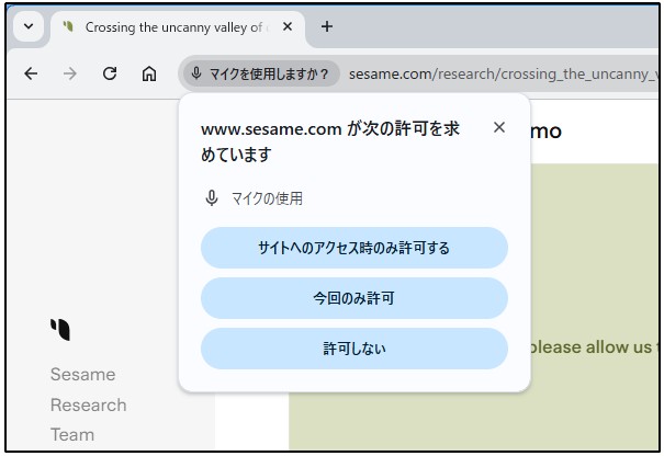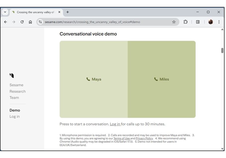 Sesameのサイトには「Demo」というページがあり、そこにある「Conversational voice demo」というところに「Maya」と「Miles」の2モデル(それぞれ女声と男声)が用意されている。これをクリックして選択するだけで、その場ですぐに会話ができる。初回のみ、マイクの利用許可を求めてくるので許可しておくこと。