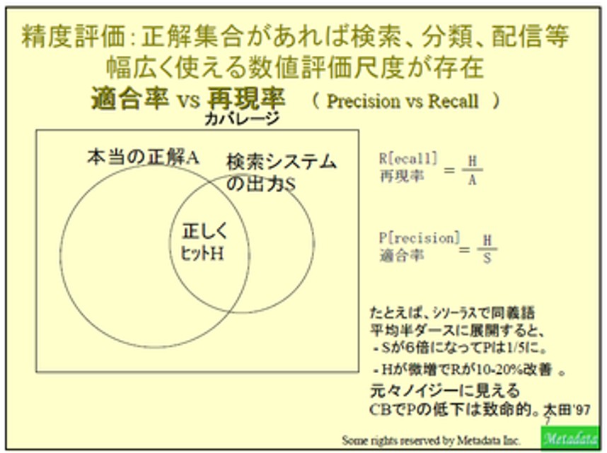 「再現率 Recall(カバレージ)」とは、「本当の正解A」のうち何%を検索システムが拾えたかの数字ですので、H/A という割り算をするだけです。まさにカバー率ですね。「適合率 Precision」とは、「検索システムの出力S」のうち何%が正解だったかを示す数字ですので、 H/S という割り算をするだけです。通常ユーザに見えるのはこちらだけであり、「精度」といったら本来こちらのことに他なりません。