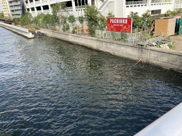 ライフを出て、さらに進むと東雲橋に到着。橋を渡る途中で気になったのが海抜だ。写真のとおり、橋のすぐ下に海が見えており、豊洲一帯が平地であることがわかる。ただ江東区としては、南海トラフ巨大地震や首都直下地震など想定され得るあらゆる地震において、「堤防や防潮堤を越えるほどの大きな津波に襲われる可能性は極めて低い」と示していた。