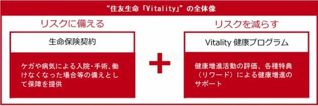 リスクに備える生命保険契約として「死亡保障・高度障害保障」「生活障害収入保障特約(=就労不能・介護保障)」「認知症保障」「医療保障」から必要な保障を選んでオリジナルの保障を組み立てることができる。これに「Vitality健康プログラム」をセットしたものが「Vitality」となる。