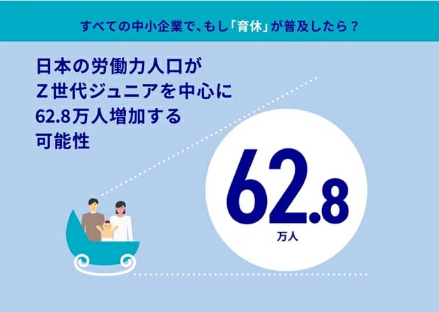アクサ生命保険株式会社が公開した「中小企業990社から見える『日本の未来経済ポジティブ推計』」では、育休に関する推計結果についてまとめています。明治大学 市川名誉教授の推計によると「すべての中小企業で、『育休』が普及した場合、日本の労働力人口がZ世代ジュニアを中心に62.8万人増加する可能性」があるとのこと。中小企業は日本の企業数の99.7%を占める為、インパクトのある結果にも納得です。